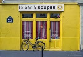 Questa mia piccola passeggiata parigina prevede anche una pausa pranzo. Se cercate mete foodies naturalmente a Parigi avrete l’imbarazzo della scelta (compresa la malsana possibilità di pranzare in pasticceria a suon di macarons o éclairs)! Io però vi suggerisco un posto che può esistere solo in una grande città, un posto speciale, adorato da chi a Parigi ci vive, e ha bisogno di un pranzo veloce, sano e anche economico. Io credo che dia il meglio di sé in autunno, quando il cielo diventa basso e grigio, quando il clima continentale si fa sentire e quando a metà giornata c’è bisogno di una pausa corroborante. Sto parlando del giallissimo Bar à Soupes di Catherine Bley, che ogni mattina con verdura rigorosamente di stagione prepara ben sei zuppe differenti da servire ai suoi clienti. Circa una decina di anni fa Catherine, ispirata dalla variegata realtà newyorchese della ristorazione, ha deciso di cambiare completamente vita e lanciarsi nel progetto di un bizzarro Bar à Soupes. Il sogno ha impiegato tempo per diventare realtà, e alla fine, zuppa dopo zuppa, esperimento dopo esperimento Catherine ha aperto a Parigi il primo Bar à Soupes di Francia e, contemporaneamente, ha pubblicato il suo personale libro di zuppe (lo trovate in vendita anche nel bar). L’idea è semplice: il Bar à Soupes è un posto easy in cui si può magiare veramente bene, (anche per i vegetariani), e senza incappare nelle solite mollicce verdurine al vapore / insalatona mista. Ecco, la genialità dell’idea di Catherine è quella di rendere divertenti le verdure, di togliere alle zuppe quel senso di triste banalità con accostamenti inediti e sapori curiosi. Nelle zuppe di Catherine le verdure sorridono. Sorriderete anche voi dopo averle mangiate…