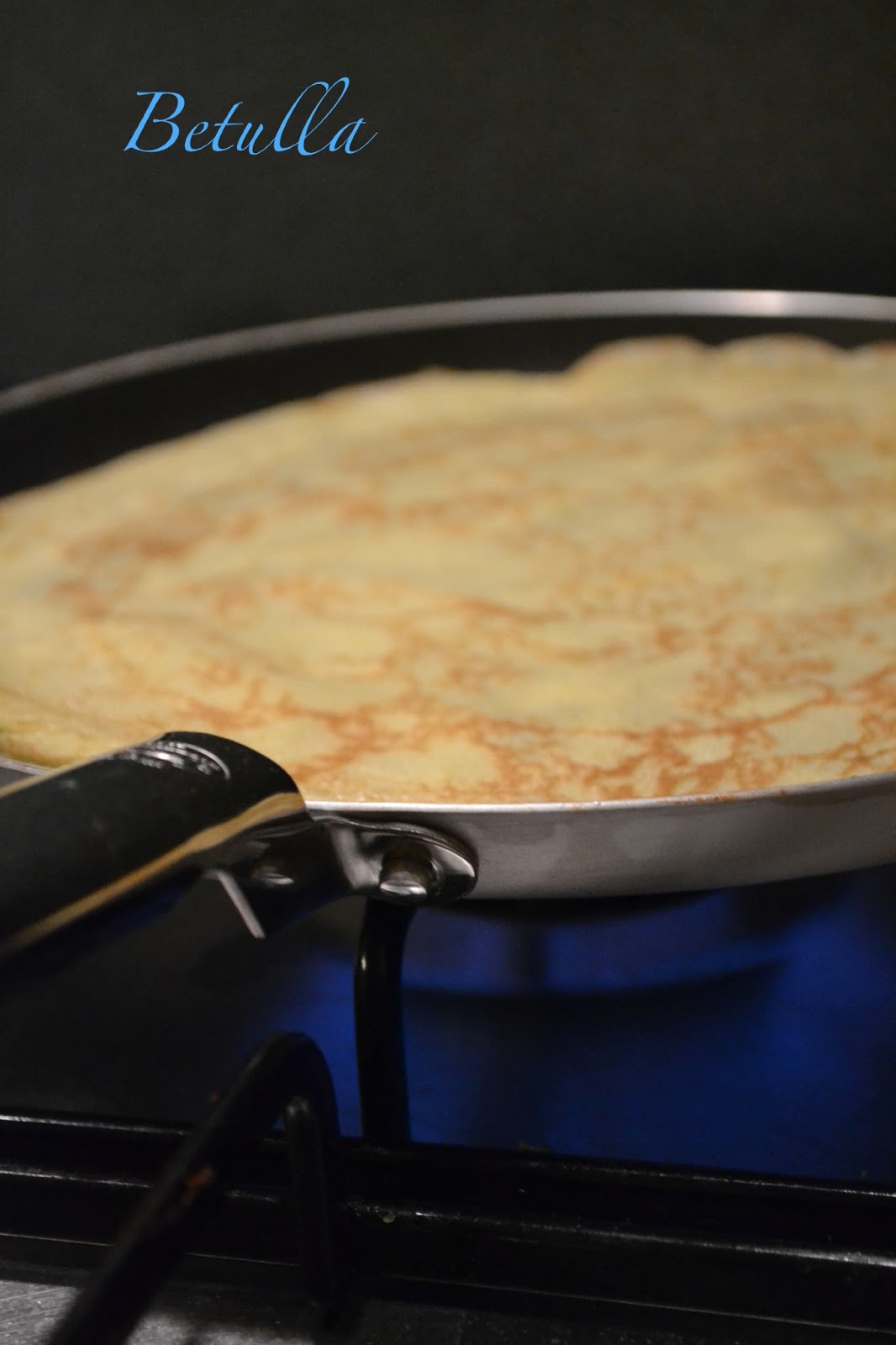 Procedere con la cottura delle crĂŞpes: scaldare lâapposita padella (se non lâavete va benissimo una padella antiaderente da 24 cm), distribuire un filo dâolio sul fondo della padella con un paio di fogli di carta assorbente. Abbassare la fiamma a attendere qualche istante. Quando la padella è abbastanza calda, ma non rovente rovesciate un mestolino di pastella (circa 50 ml per crespella). Questo passaggio è fondamentale, e ahimè, va fatto anche velocissimo. Occorre distribuire con rapiditĂ il composto su tutta la superficie della padella (senza lasciare buchi, mi raccomando). Chi è un poâ piĂš esperto lo fa con il movimento del polso, cioè fa roteare lievemente la padella…per tutti gli altri esistono delle spatole âfrancesissimeâche in teoria facilitano questa operazione. Quando i bordi della crespella iniziano a indurirsi e dorarsi bisogna girala. Ora, i soliti piĂš esperti lo fanno con una semplice spatola di legno, i maghi dei fornelli lo fanno praticamente al volo, e i comuni mortali con un piatto o un coperchio (esattamente come per le frittate). Continuate cosĂŹ per tutte e cinque le crepes che vengono fuori con questa dose. Lo so, la ricetta è per due, ma giĂ che uno si mette vuoi non farne due anche per dopo…da farcire con qualcosa di dolce???
