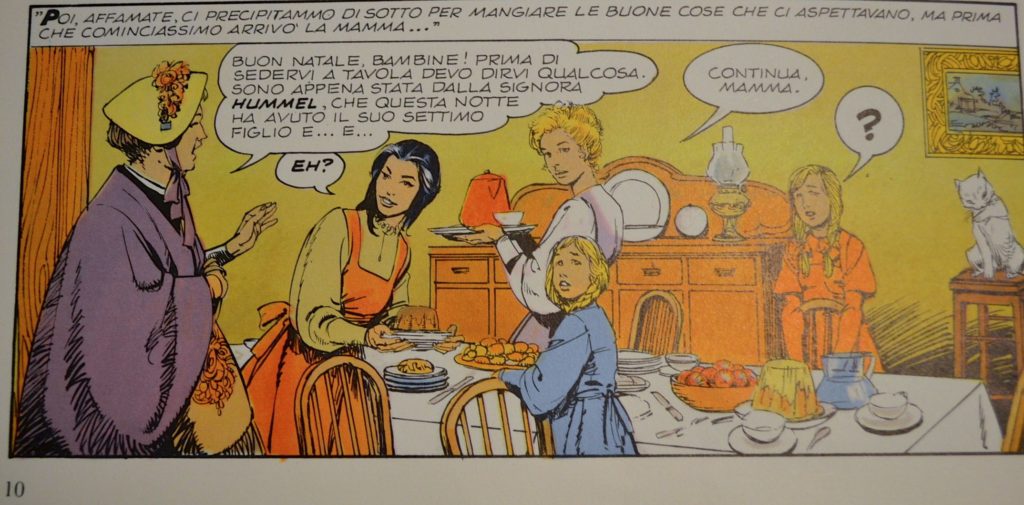 Il romanzo, pubblicato nel 1868 in America, è la storia delle quattro sorelle March – la giudiziosa Meg, l’impertinente Jo, la dolce Beth, la vanitosa Amy – dei loro sogni e speranze di adolescenti sullo sfondo dell’America scossa dalla guerra di Secessione. Da un Natale all’altro, per un anno intero, Louisa May Alcott ci racconta le vicende delle quattro ragazze con un’ analisi psicologica così penetrante da farci sentire le chiacchiere, i capricci, le difficoltà e gli entusiasmi delle quattro piccole donne come attuali e vicini. Non a caso il libro è tutt’ora un grande classico dell’infanzia. Forse il mondo di oggi funziona in un’altro modo rispetto a quello del 1860, ma i legami famigliari, gli affetti e i sentimenti di una famiglia che si stringe nelle difficoltà come nelle gioie della vita sono identici. Motivo per cui sono felice di avere ricevuto in regalo ancora piccolissima una edizione di “Piccole Donne” a fumetti, poi soppiantata dal romanzo vero e proprio. La mia immaginazione è legata a quei disegni…le mie piccole donne sono loro…e così le immagino incamminarsi verso la casa degli Hummel per regalare loro la colazione di Natale… o recitare una sgangherata “commedia per signorine” e pasteggiare allegramente con i doni del ricco vicino di casa…pur con un pensiero rivolto al triste Natale del padre lontano da casa per la guerra.
