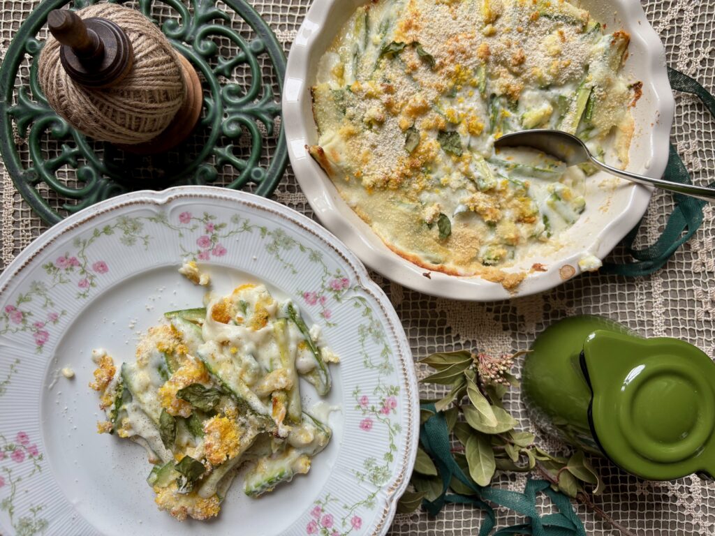 Anche oggi condivido con voi una “ricetta d’antan“. Un po’ lo capisco che queste “zucchine alla piemontese” siano ormai completamente dimenticate… Per prima cosa hanno come competitor le ben più celebri “zucchine in carpione”, poi sono uno di quelli che io definisco “piatto ossimoro” perché le zucchine tenerelle sono un fresco ingrediente primaverile, ma questa ricetta le vuole ben coperte e gratinate al forno come se si dovessero riparare in teglia dai primi freddi d’autunno. Infine c’è la besciamella, che al momento in Italia gode di pessima fama, o meglio, è d’uso snobbarla e criticarla, prima di mangiarla con gusto (ma ci rendiamo conto di cosa sarebbe la cucina italiana senza le lasagne?). Certo il fatto che queste “zucchine alla piemontese” fossero considerate un tempo come un leggiadro contorno forse non ha contribuito alla loro sopravvivenza: oggi si apprezzano di più verdurine atletiche, magre, nervose, semi crude, che sfiorano appena condimenti e padella! Ma spostando dolcemente nel menù le “zucchine alla piemontese” verso l’isola di Avalon dei “piatti unici” (isola sfuggente colma di mistero e magia e avvolta da nebbie eterne) sono convinta che possano ancora allietare con grazia molti palati bacucchi (più attenti ai sapori che alle circostanze). 😉